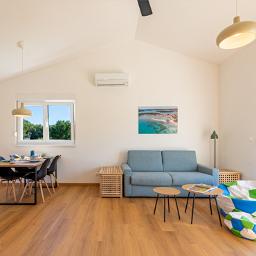 • Living room: spacious, air-conditioned, with smart TV; the sofa easily transforms into a bed for two (140 × 200)