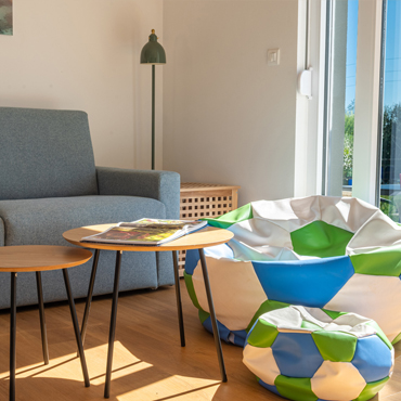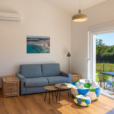 • Living room: spacious, air-conditioned, with smart TV; the sofa easily transforms into a bed for two (140 × 200)