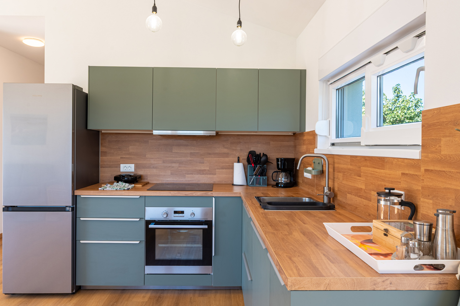 • Kitchen: fully equipped (dishwasher, refrigerator, freezer, induction cooktop, oven, dishes, coffee machine, toaster, electric kettle, …)